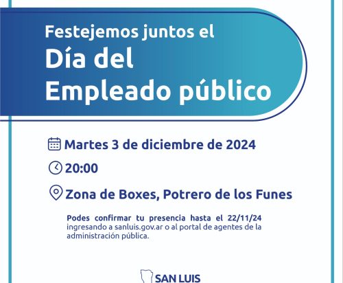 Los agentes de la administración pública provincial celebran su día cada 4 de diciembre. Y, este año, el Ejecutivo Provincial los agasajará el martes 3 a partir de las 20:00 en un encuentro en Boxes de Potrero de los Funes. Hasta el momento, ya se han anotado más de 3 mil empleados. Hay tiempo para inscribirse hasta el viernes 22, a través del Portal de Agentes.